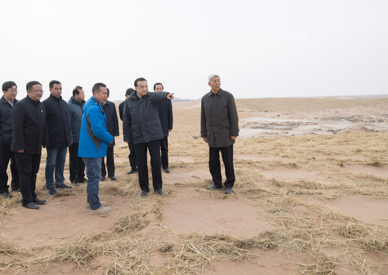1月27日至28日,春节前夕,中共中央政治局常委、国务院总理李克强在甘肃金昌、武威考察。这是1月27日,李克强在武威市民勤县草方格固沙点听取甘肃防沙治沙工作汇报。新华社记者 王晔 摄