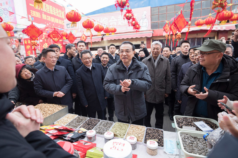 1月27日至28日,春节前夕,中共中央政治局常委、国务院总理李克强在甘肃金昌、武威考察。这是1月27日,李克强在金昌市金三角市场询问年货供销、价格等情况。新华社记者 王晔 摄