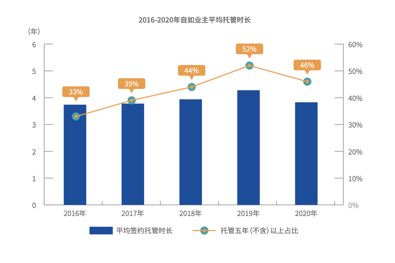 另一方面,更好的出租效果,也带来了更强的托管认同。《蓝皮书》调研显示,2016-2020年间,业主平均托管时长约4年,但寻求5年以上托管的业主比例有所提高,从2016年的33%提升至2019年的52%。即便在2020年行业受疫情影响,这一比例仍与疫情之前持平。