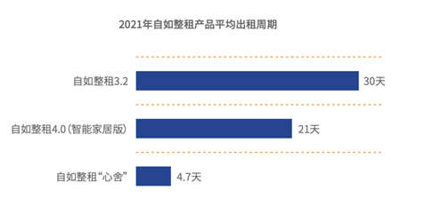 而当房屋经整体改造得到品质提升时,市场竞争力和出租效率也会提高。以自如整租产品为例,配备智能家居的4.0风格房源平均出租周期约21天,而智能家居覆盖度、居住风格美观度再度提升的“心舍”房源则为4.7天。
