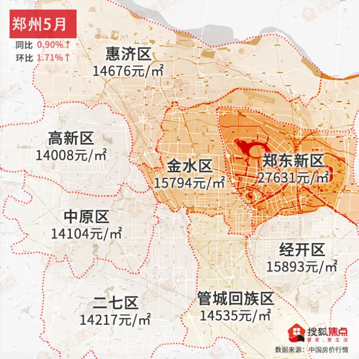 郑州5月均价为14864元/㎡同比上涨0.90%↑,环比上涨1.71%↑