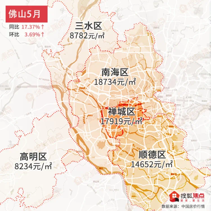 佛山5月均价为15592元/㎡同比上涨17.37%↑,环比上涨3.69%↑
