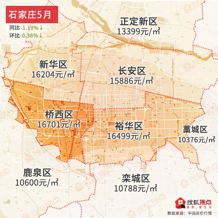 石家庄5月均价为14704元/㎡同比下跌-1.19%↓,环比下跌-0.36%↓