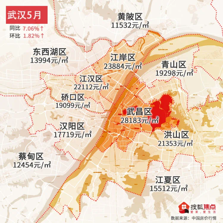 武汉5月均价为20219元/㎡同比上涨7.06%↑,环比上涨1.82%↑