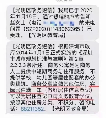 按照前文网友爆料的光明区政务短信,我们能够得到的信息是,光明区的商务公寓与上面各区不同,被归类为其他住宅,需要住满一年才可以申请学位。