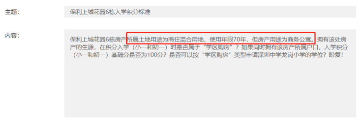 无独有偶,又有人截图爆料,称深圳龙岗区的保利上城花园6栋(商务公寓)也可申请学位,小孩落户在该房产基础分100分。