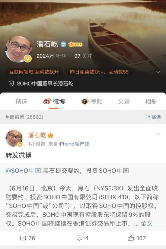 6月16日晚公告发出后,潘石屹排名前列时间在微博上转发了SOHO中国的官宣微博,没有任何配文。