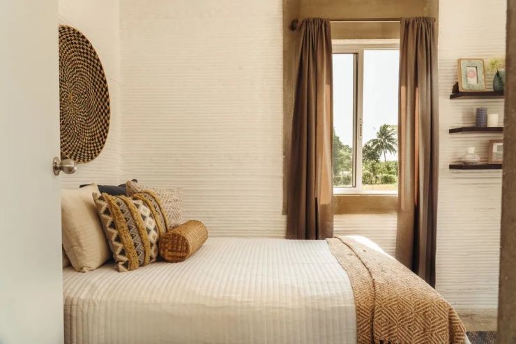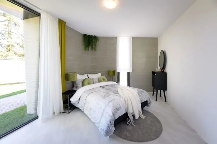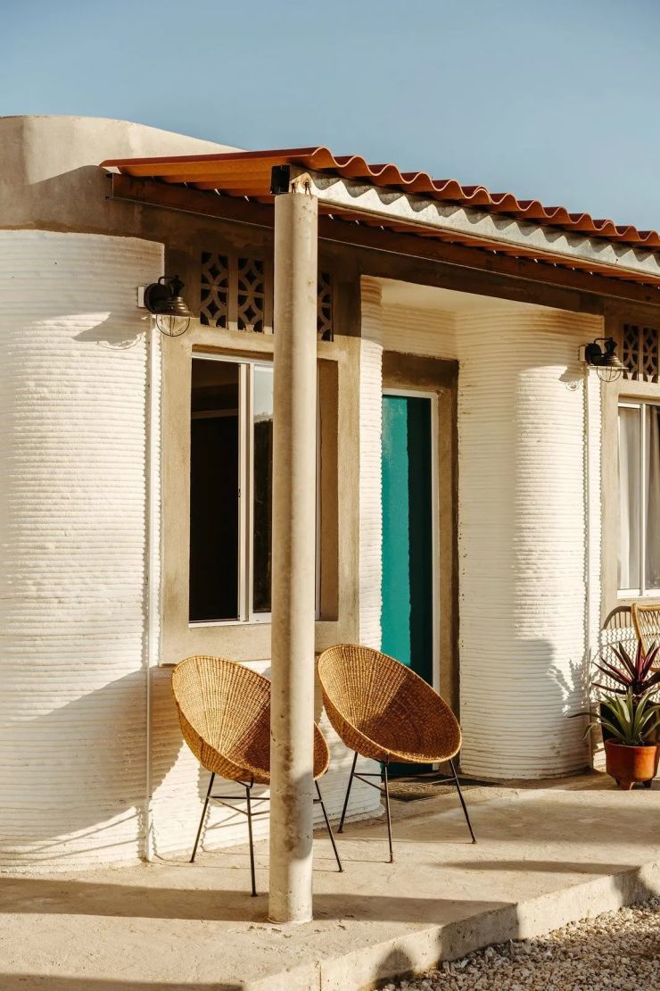 每栋3D打印房屋面积约为500平方英尺,拥有有两间卧室,一个浴室,一个环绕的水泥庭院可以供孩子们玩耍,前廊还有一个适合乘凉的遮阳篷。
