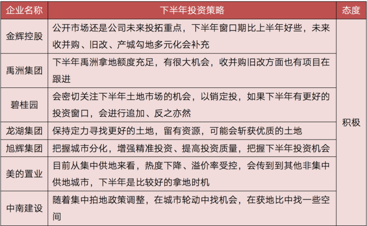 在公开业绩发布会的40余家房企中,有不少也公开了下半年的市场预期及投资策略,近3成左右呈现较为积极的投资态度。主要是由于第二轮集中供地的大范围延期、规则调整给企业带来了一定的正面情绪。部分企业认为这样的调整将带来一定的投资窗口期,且溢价率受到控制,拿地安全性得以提高。如金辉、碧桂园、大悦城等均表示将密切关注下半年土地市场的机会,认为下半年窗口期比上半年好一些。而金辉、碧桂园上半年拿地销售比不足0.3,为下半年预留了较多的投资额度,因此更有积极参拍的底气。