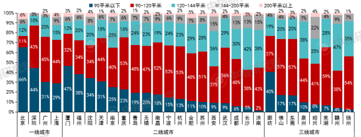 图:2021年上半年30个代表城市各面积段住宅销售套数占比