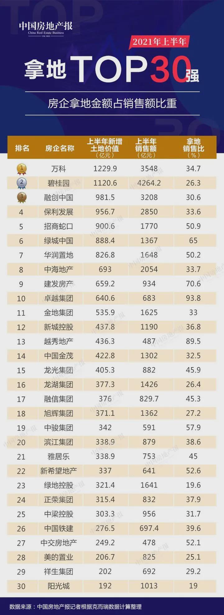 然而此前中国房地产报道,根据买地金额不得超年度销售额40%上限,2021年上半年拿地30强房企中,有12家已经过线。部分“三道红线”内绿档位房企,上半年的拿地量也几近与去年全年拿地总量持平。
