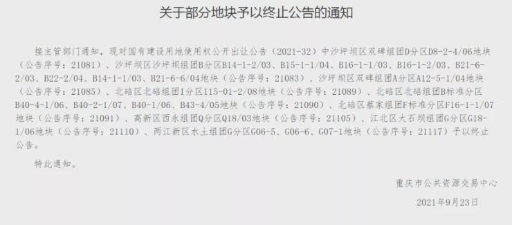 近日,重庆第二批集中供地的排名前列土拍日来临之际,重庆市公共资源交易中心通知本次土拍中9宗地块终止出让。