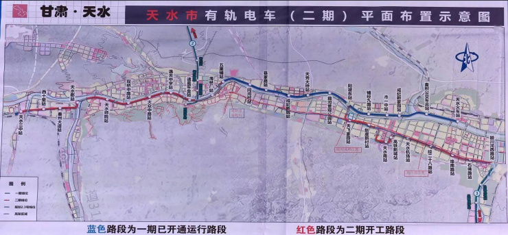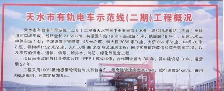 天水市有轨电车示范线(二期)由天水市三中至五里铺段和阳坡东站至颍川河口段组成,线路全长21.597km;共设置车站19座(高架站1座、地面站18座);新建停车场1处;同步实施羲皇大道提升改造18.3km和地下综合管廊11.58km,以及相应的供电、通信、信号、给排水、消防、绿化等配套工程。估算总投资65.47亿元,建设期3年。二期项目建成后,将在天水城区构建起功能层次清晰、覆盖客流走廊、强化枢纽衔接、运营里程达34.6km的一体化轨道交通网络。