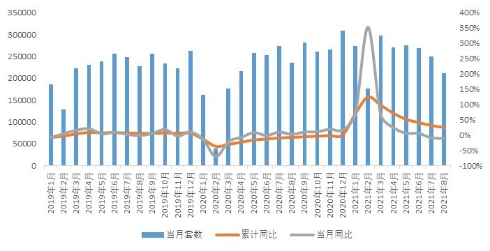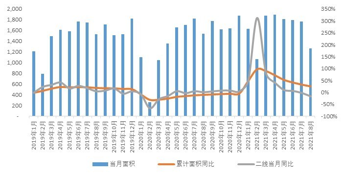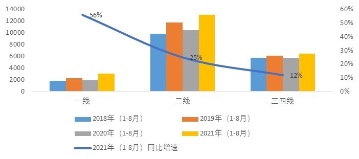 8月一线城市市场活跃度仍为较高,但降速放缓。同比2020年,一线、二线、三四线城市新房成交面积累计同比分别增长56%、25%、12%,环比上个月分别回落8%、7%、6%,其中一线、三四线城市新房成交面积累计同比降速放缓,二线城市保持稳定。