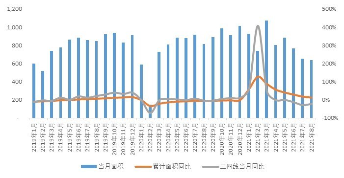 图:66座大中城市中三四线城市月度成交面积及累计同比
