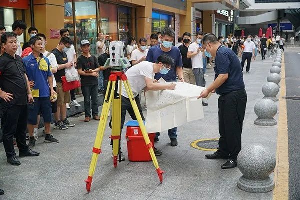 2021年5月18日,深圳赛格大厦发生摇晃,在内办公人员撤离后,工作人员在现场测量。图|IC photo