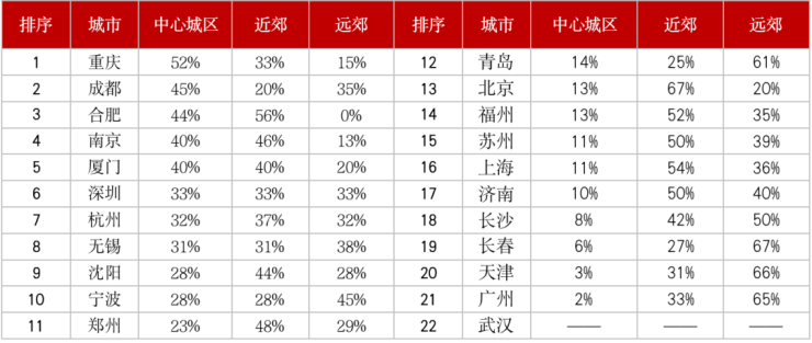 在供地结构来看,除重庆、成都等少数城市将供地主力放在中心城区外,其余城市的供地主力集中在郊区,供应量占比基本都在6成以上,中心城区则仅有少量地块供应。