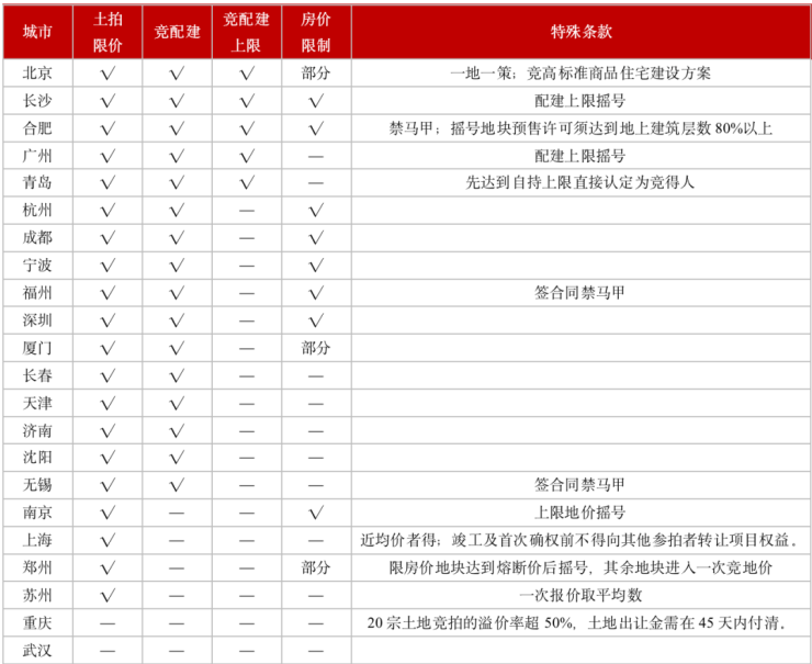 在与项目盈利空间最直接关联的地价方面,22城中除重庆外,其余城市均设置了地价上限,大部分城市溢价上限基本控制在30%左右。