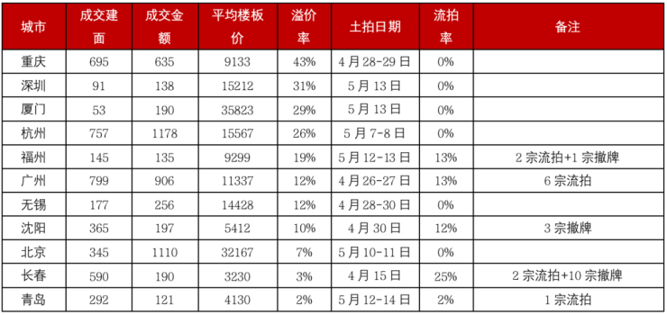 从市场热度上来看,依然是不限价的重庆溢价率水平较高,溢价率高达43%。其次是深圳和厦门,虽然参拍地块较少,仅有5、6宗,但依然吸引了大量知名房企参与,两城整体溢价率均在30%左右,市场热度高涨。
