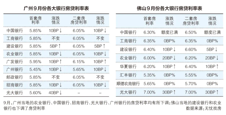 数据显示,9月份广州当地的农业银行、中国银行、招商银行、光大银行、广州银行的房贷利率均有所下调;其中光大银行首套房贷利率降幅达40BP;佛山当地的建设银行和农业银行也下调了房贷利率,其中农业银行的首套房和二套房贷利率均下调20BP。