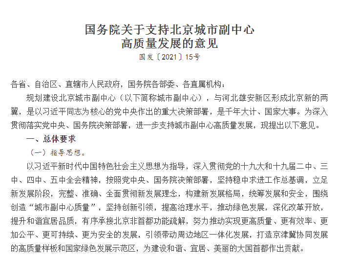 【环球网房产报道】近日,国务院印发《关于支持北京城市副中心高质量发展的意见》。