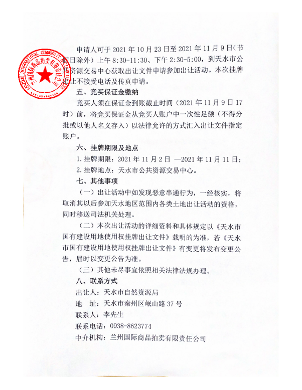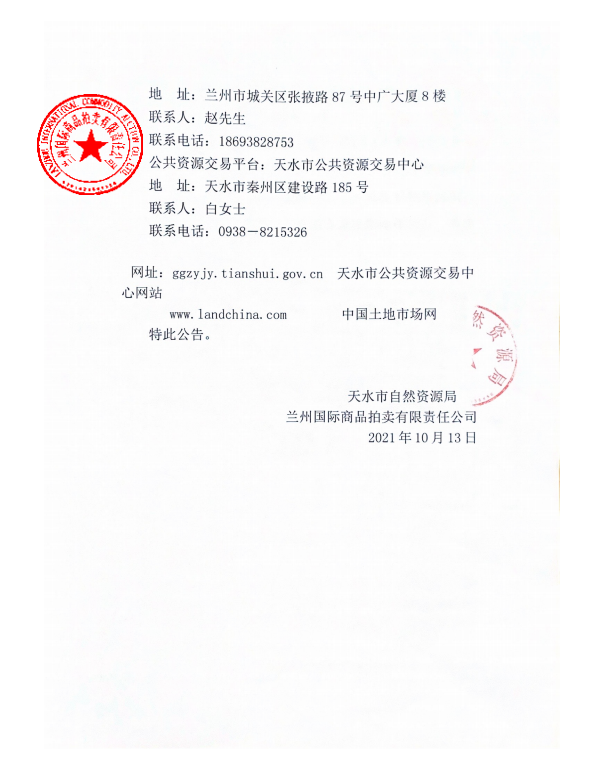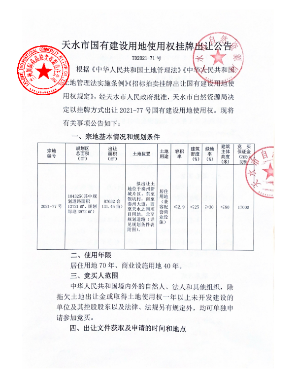 12月28日,天水市公共资源交易中心发布一则关于“天水市2021-77号国有建设用地使用权挂牌出让公告”的招标/资格预审公告,据公告获悉:该宗地编号2021-77号规划区总面积(㎡)104325(其中规划道路面积12721㎡、规划绿地3972㎡)出让面积(㎡)87632合131.45亩)。土地位置拟出让土地位于秦州新城片区。东至银坑村,南至秦州大道,西至天水之间项目用地,北至规划道路(详见规划条件表附图)。土地用途居住用地(兼容配套商业设施)容积率≤2.9建筑密度(%)≤25绿地率(%)≥30建筑主体高度(米)≤80。