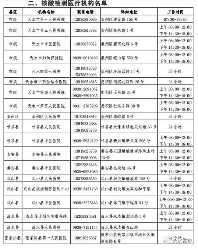 天水市春节期间核酸检测医疗机构名单及工作时间安排