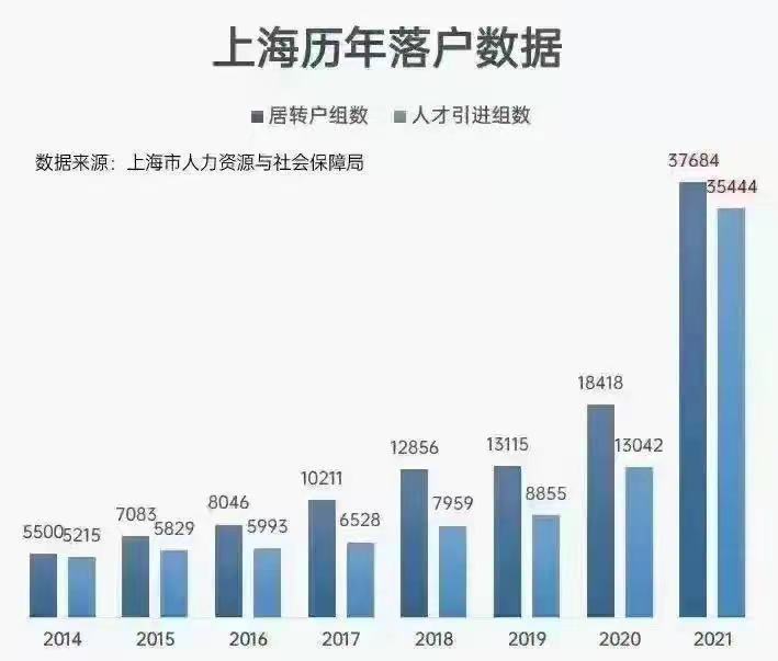 2021年持上海居住证落户的居民达到了37684人,同比增加了104.6%;通过“人才引进”渠道获得上海户口的为35444人,同比增加了172%!