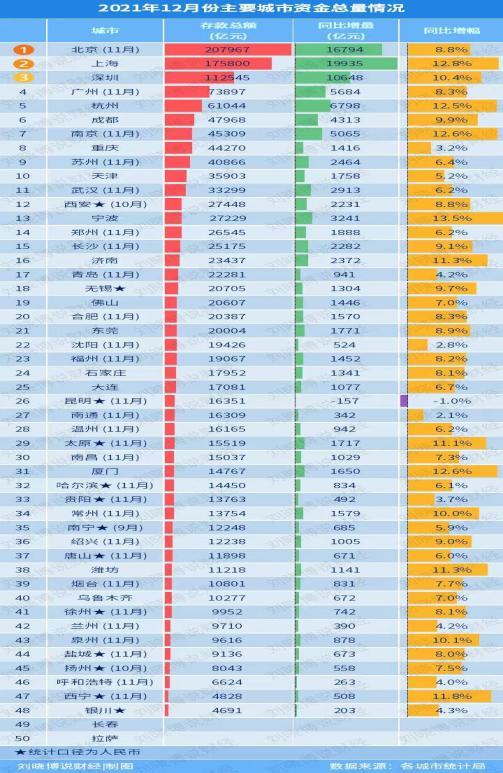 上图是中国内地50个主要城市的资金总量,有些城市只公布了11月或者10月的数据,长春拉萨的2021年数据一直没有公布。