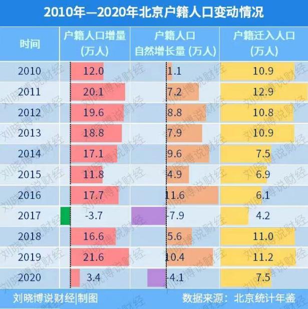 (上图:北京户籍人口变动情况,最近3年迁入数出现了反弹。2021年数据尚未公布)