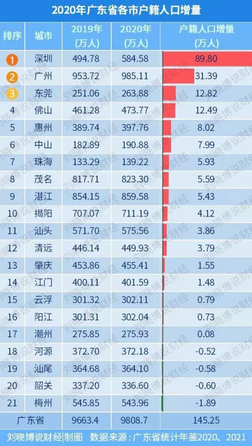 上图是2020年广东省各城市户籍人口增长情况。其中包含了户籍人口的自然增长和迁入。(2021年数据尚未公布)