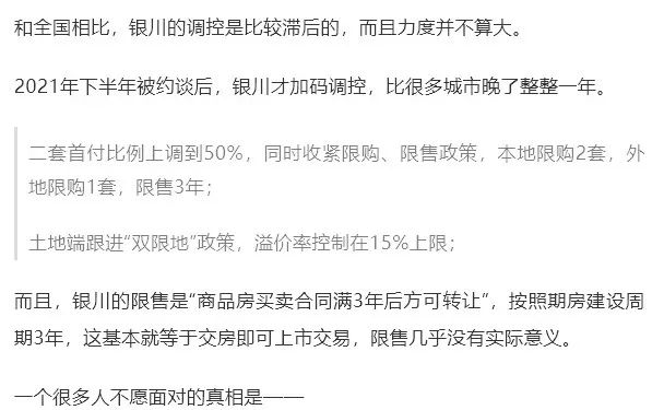 过去,银川常住人口是非常稳定的,每年增长约几万人。但2019年末,银川市常住人口229.31万人。一年时间,银川市人口增长了56.59万人;这都是购房主力军。其三:调控较晚,且并不算严。