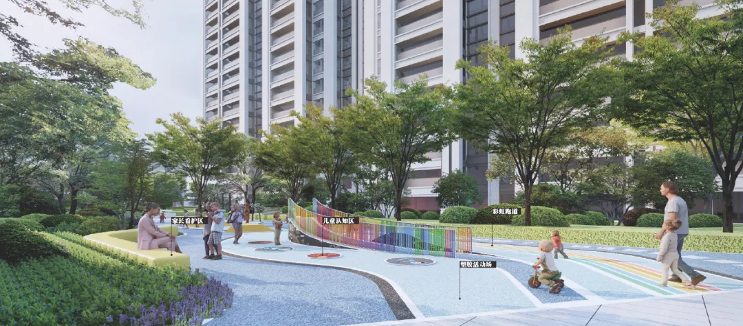 不仅可“观”,更可参与。园林设置有约650m低碳环氧绿色轻跑道、约1063㎡全龄儿童活动区、约2300㎡全龄健康运动场及约1700㎡中央互动大草坪。