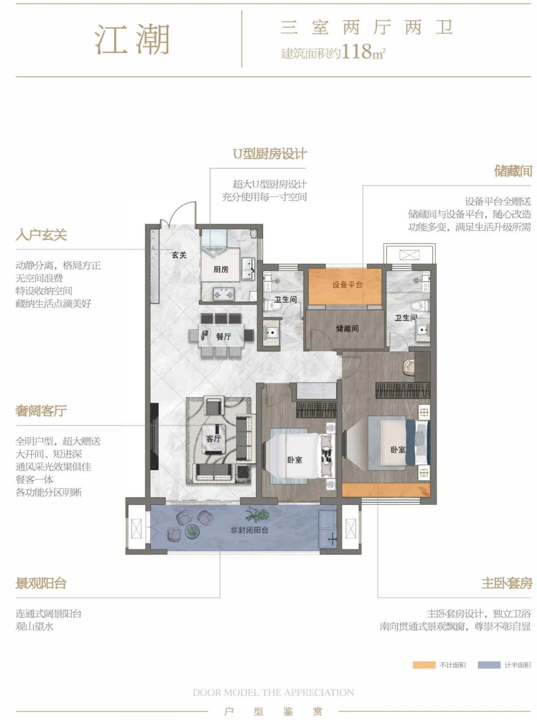 建面约118平方米和建面约131平方米的主力户型,三室两厅两卫,舒适性和功能性兼具。