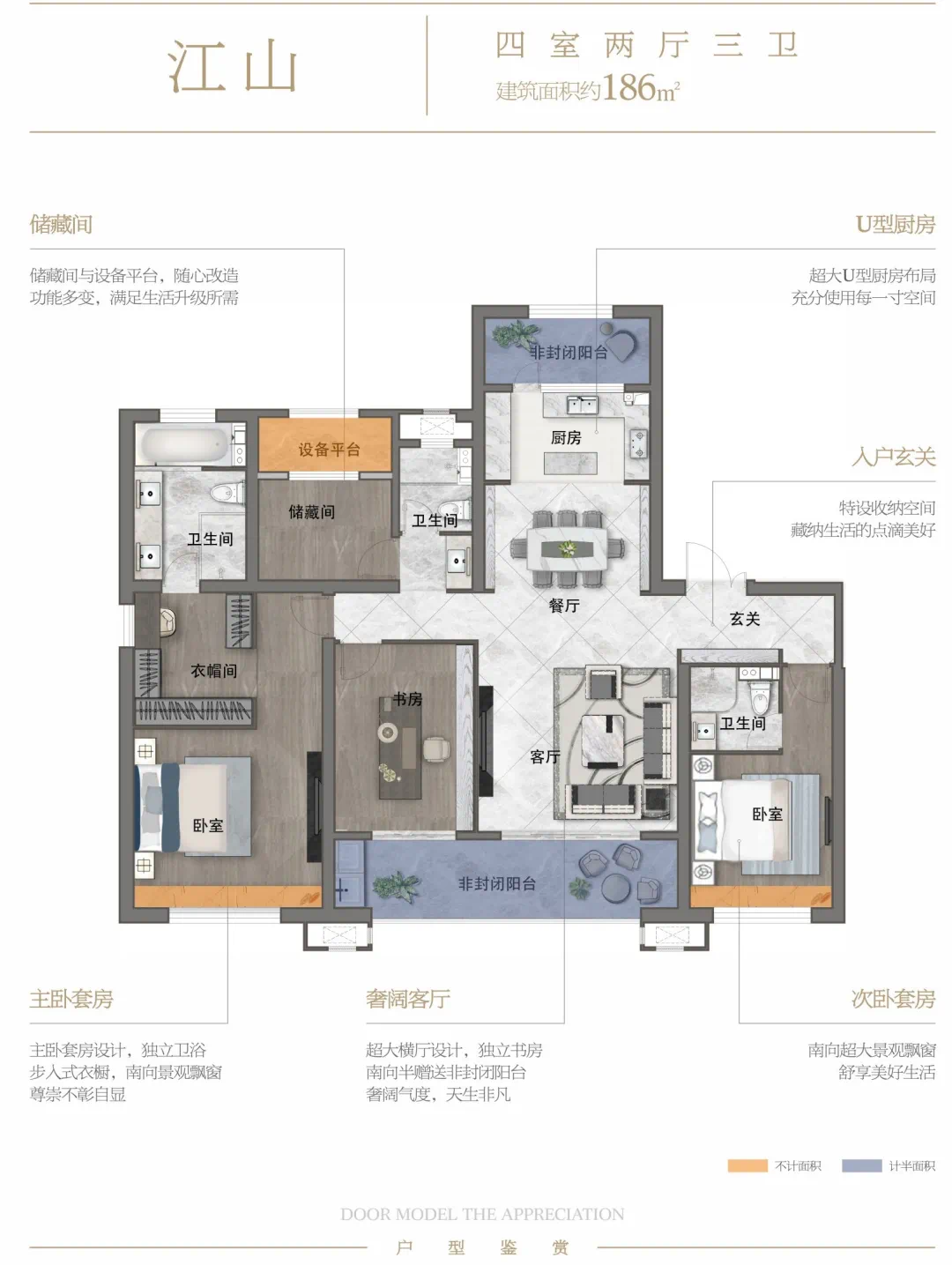两个四房户型更是做到了四开间朝南、大横厅,南北双阳台,更通透舒适,大宅的尺度感尽显。