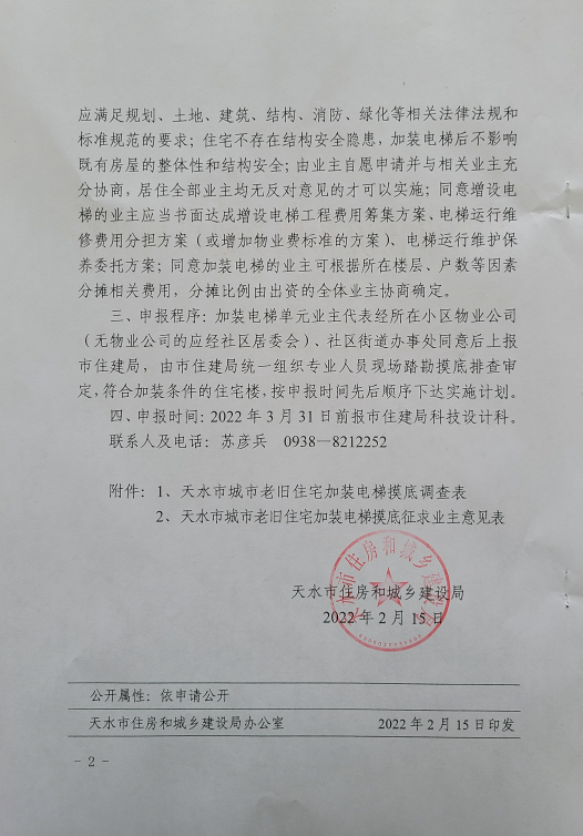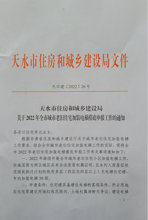 原标题:天水市住房和城乡建设局关于2022年全市城市老旧住宅加装电梯摸底申报工作的通知