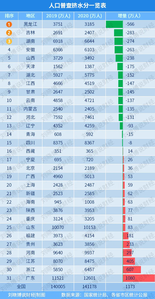 可以看出,这次人口普查里被挤水分最多的省份是黑龙江,1年之间人口减少了566万。其次是吉林、湖南、安徽、山西,被挤水分也都超过了200万。