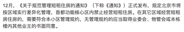 而就在去年的12月,北京住建委等四部门联合下发了《关于规范管理短租住房的通知》。