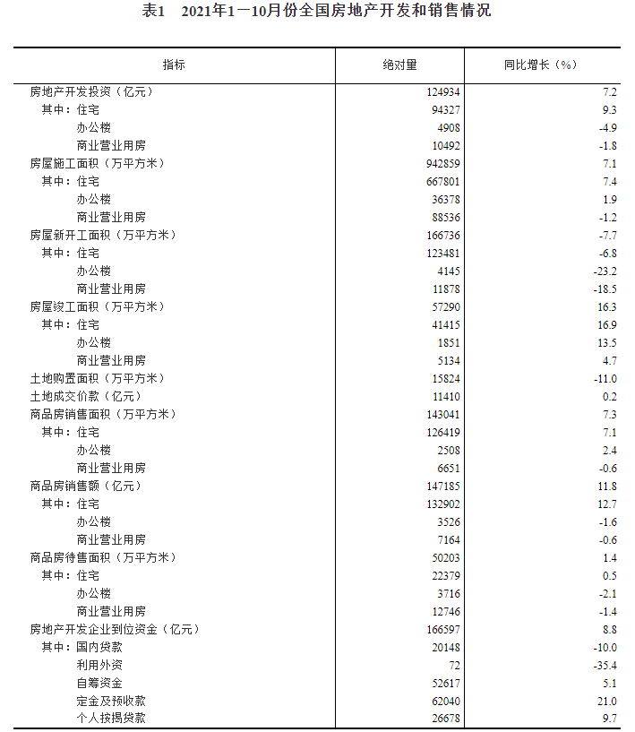 较新!2021年1—10月份全国房地产开发投资增长7.2%