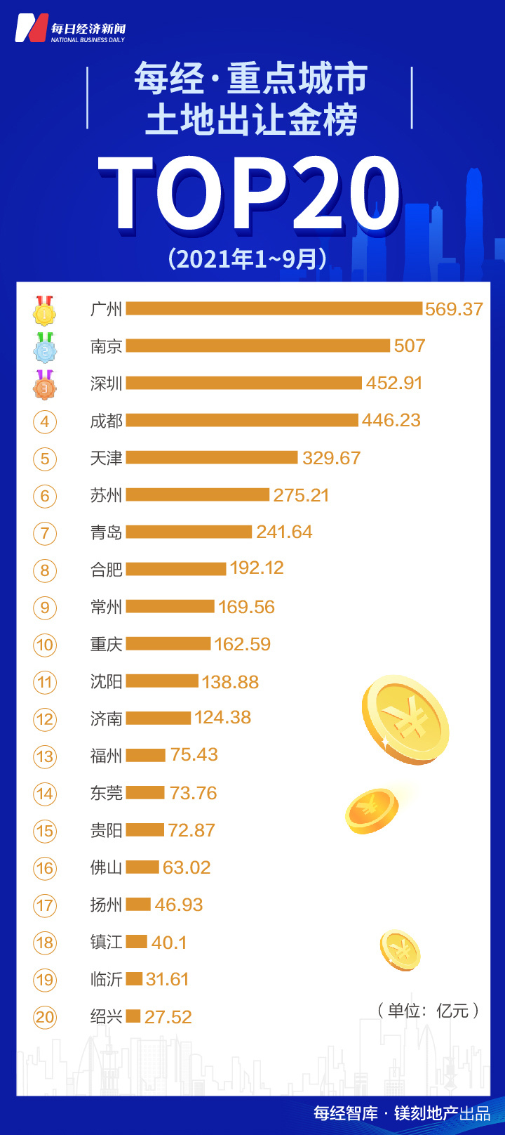 广州以土地出让金569.37亿元荣登榜首,第二名南京土地出让金也超过500亿元。一线城市中,仅广州、深圳入榜,均位于榜单前三;新一线城市及二线城市成为榜单主力;但城市间分化也较为明显,三四线城市中的东莞、绍兴、临沂等均未能超过100亿元。