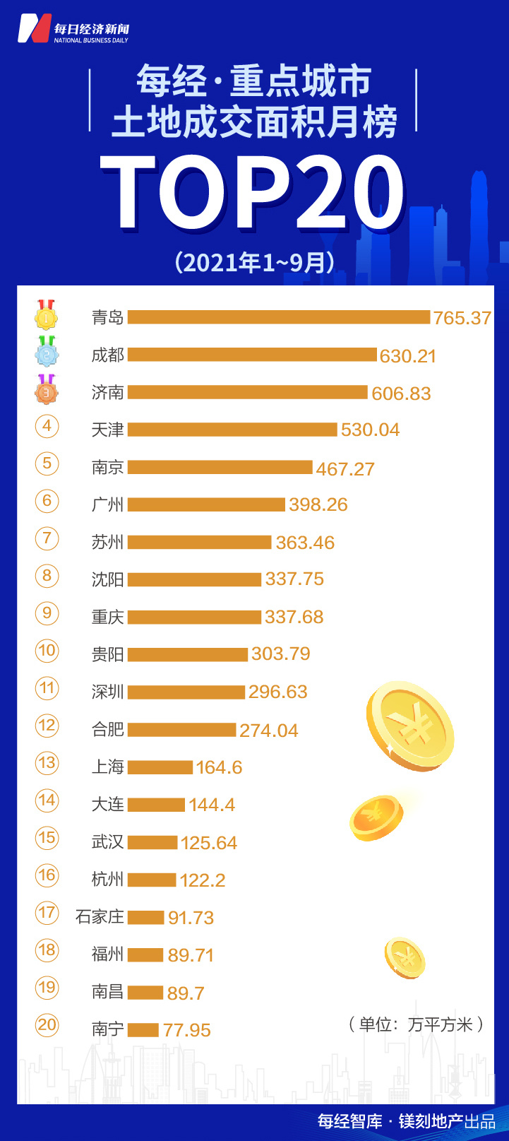 根据中指数据,2021年9月土地成交面积TOP20城市总计成交面积6217万平方米,环比1-8月(1320万平方米)增长了5倍。