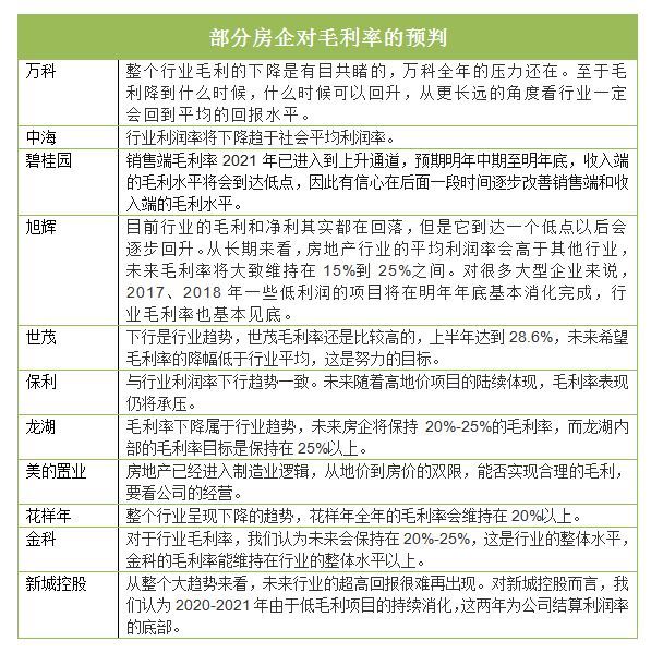 旭辉控股董事局主席林中则提到,房地产行业经历过了土地红利时代,经过了高杠杆盈利的时代,未来将迈进管理红利和品牌红利的时代,不可能再回到暴利时代。在国家稳房价、稳地价、稳预期长效机制的引导下,行业一定会走向平稳健康的发展,进入全方位高强度的竞争,所以目前行业的毛利和净利其实都在回落,但是它到达一个低点以后会逐步回升。