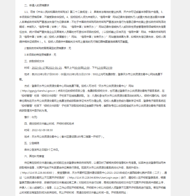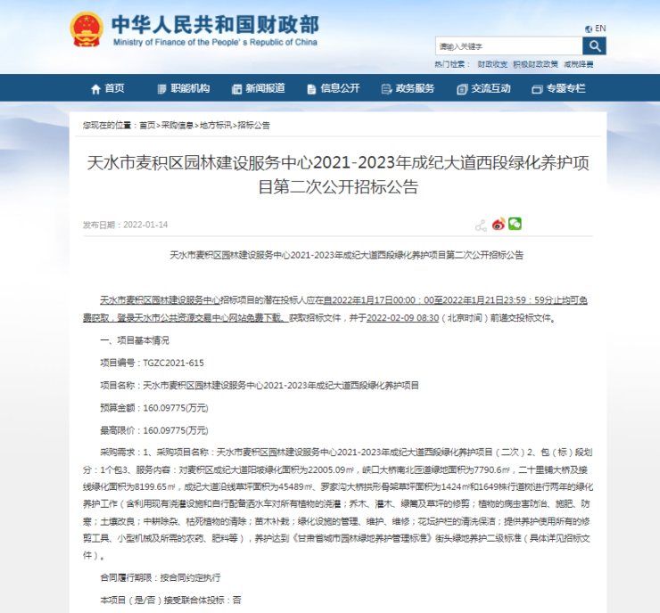 1月14日,小编从财政部官方获悉,天水市麦积区园林建设服务中心2021-2023年成纪大道西段绿化养护项目有新进展。