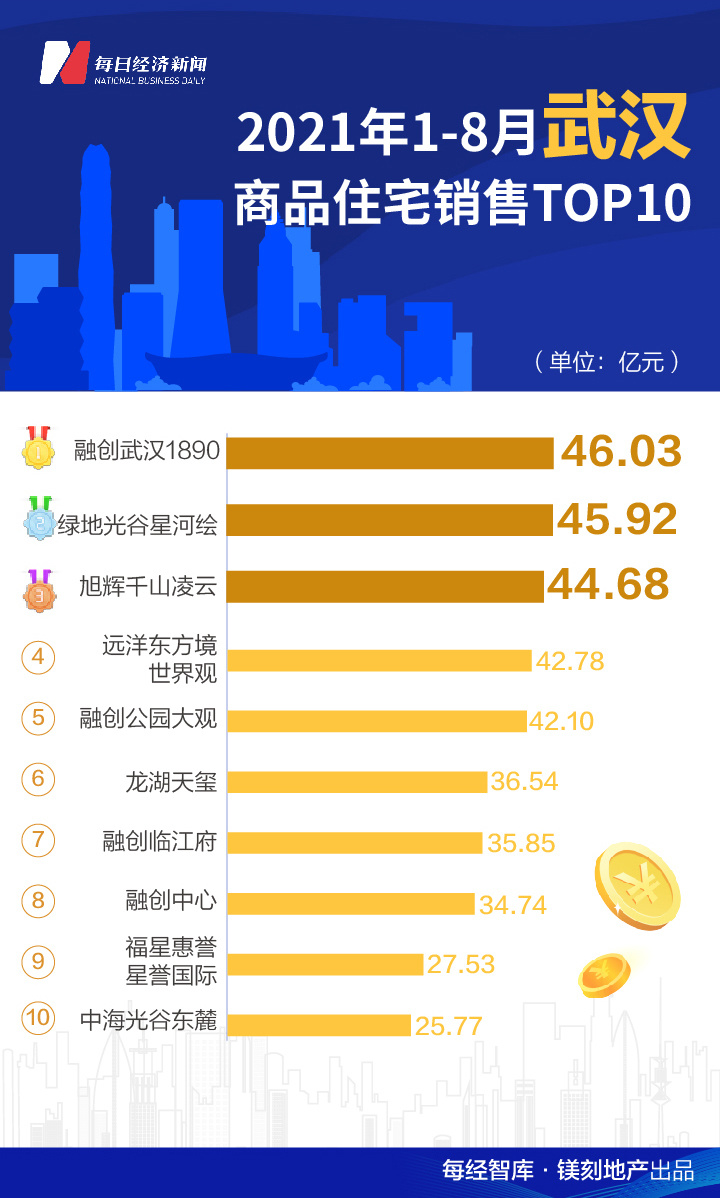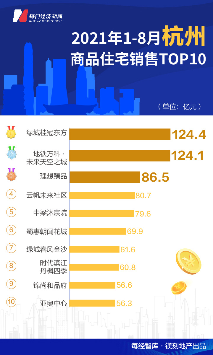 其中,杭州市销冠“绿城桂冠东方”销售高达124.4亿元,与第二名“地铁万科·未来天空之城”(124.1亿元)仅差3000万元。