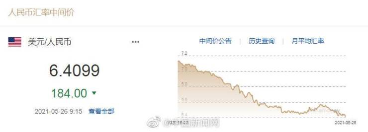 中国人民银行授权中国外汇交易中心公布,2021年5月26日银行间外汇市场人民币汇率中间价为:1美元对人民币6.4099元,较上一交易日上升184个基点,逼近6.3元时代。此外,在岸人民币、离岸人民币对美元汇率也距离6.3元时代一步之遥,离岸人民币对美元汇率一度升破6.4元关口。
