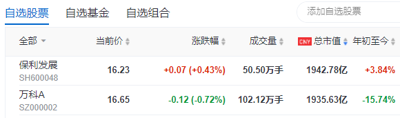 截至今天收盘,保利总市值1942.78亿元,万科总市值1935.63亿元。