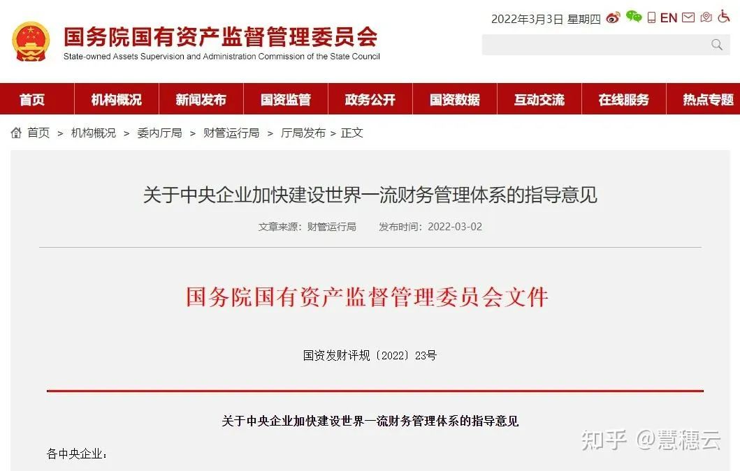 前几天,3月2日,国务院国资委公布了《关于中央企业加快建设世界一流财务管理体系的指导意见》。