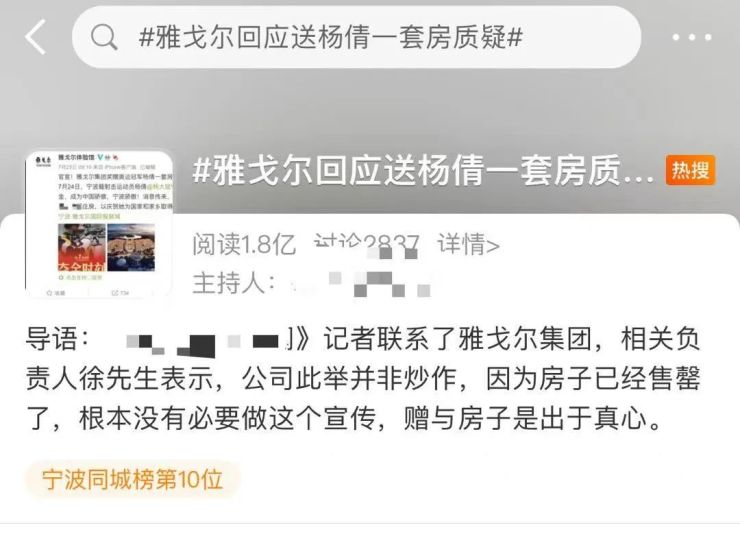 这个消息一出,雅戈尔集团瞬间进入大众视野,向奥运冠军赠房相关话题引发大量网友的关注。