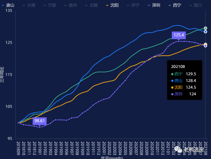 涨幅较高四城分别是西宁、唐山、沈阳、深圳,西宁29.5%,唐山28.4%,沈阳24.4%,深圳24%,其中深圳的较高点出现在2021年3月,上涨了25.4%,4月后逐步下跌。当然以上三城的房价起点比深圳低得多。