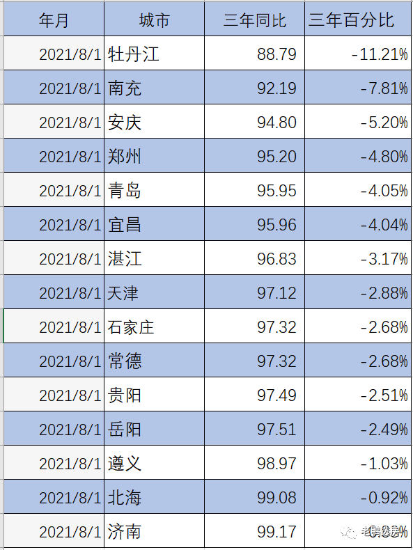 三年同比下降的有十五个城市,牡丹江作为东北的五线城市,三年下跌了11%。